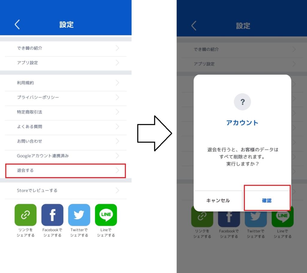 その後、アプリを端末からアンインストールすれば退会となり、データが完全に削除されます。