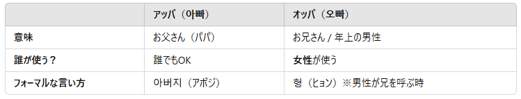 「アッパ(아빠)」と「オッパ(오빠)」は、どちらも韓国語ですが、意味が全く違います。