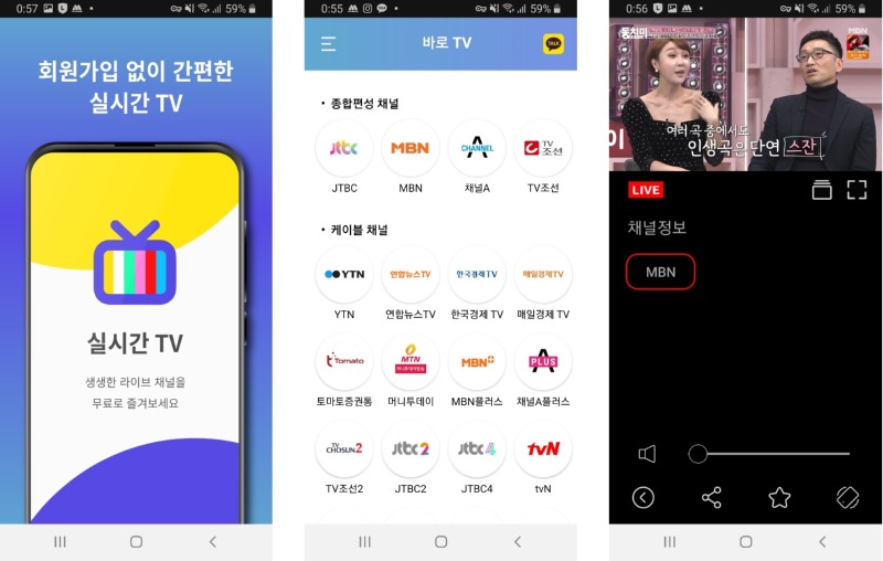 VPNアプリでIPを切り替えた後、アプリストアで「실시간TV(リアルタイムTV)」で検索すれば沢山出てくるので一番上に出てくるものをダウンロードすれば、地上波からケーブルテレビまで全て無料で視聴できます。