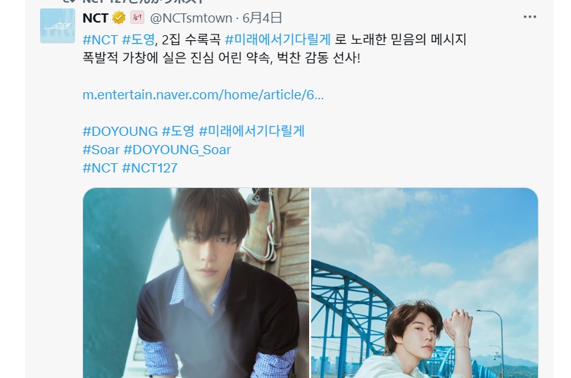 今回ははNCTの公式Xからです。ドヨンの新曲미래에서 기다릴게が発売されました。