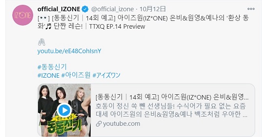 バラエティー番組「아는 형님(知ってるお兄さん)」にIZ*ONEのメンバーが出演するという予告のツイートが上がってきました。
