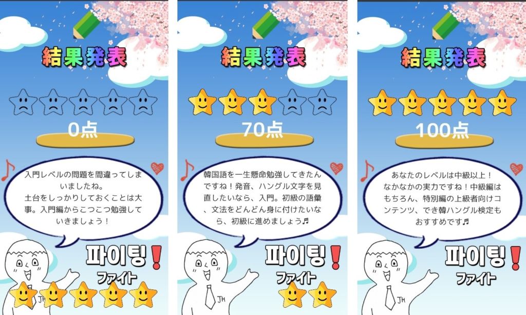 本番の試験のように計10問に対し、答えを提出すると自動的に採点が行われ、結果が発表されます。そして、結果により、パク先生からのアドバイスとどのレベルに進めばいいか、吹き出しで案内してくれます。