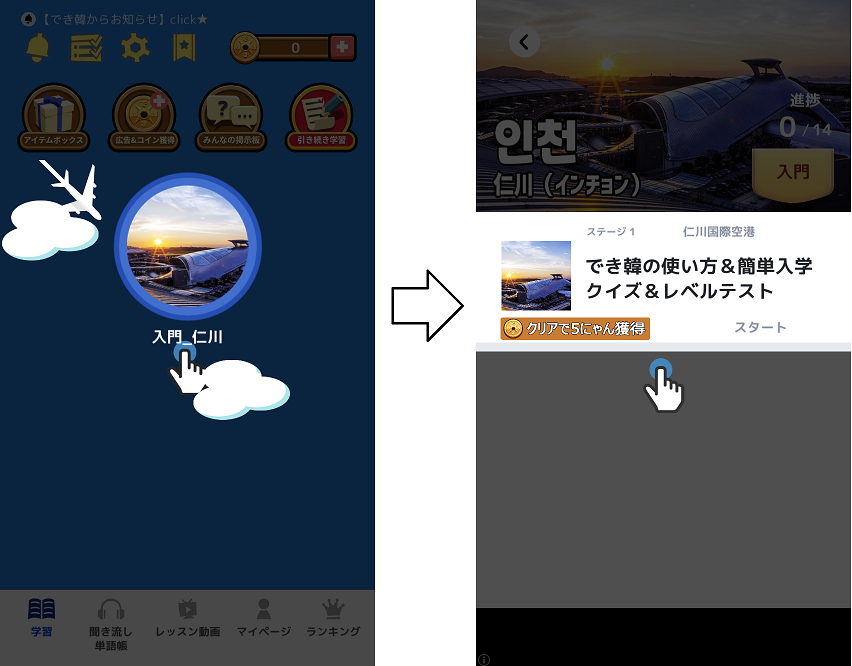 アプリをダウンロードし、立ち上げると「入門ステージ1」に案内されます。