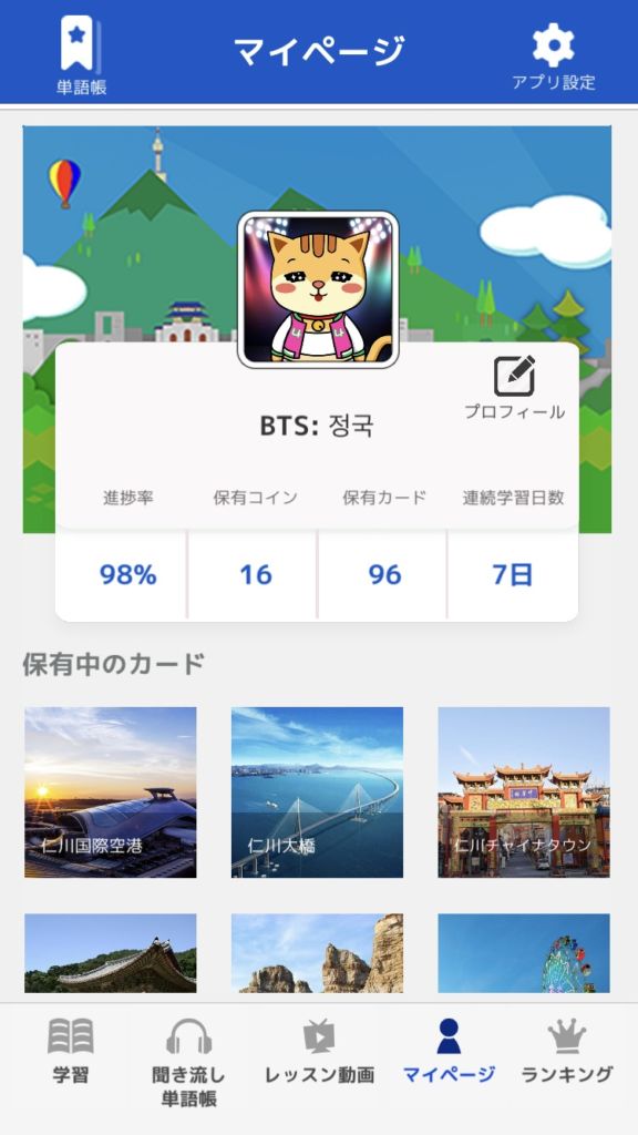 ステージをクリアすると、進捗率がどんどん上がり、観光名所カードがゲットできます。マイページで進捗率、保有コイン、保有カード、連続学習日数をチェックしてみてください。